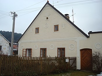 Ve vsi se vyskytuje několik lidových stavení s výzdobou ve stylu Holašovickém selského baroka - tj. rovné štíty s drobnějším štukovým dekorem. Holašovice leží hned „přes kopec" na opačné straně hřebenu. Například statek č. p. 14 z roku 1871 je zapsanou kulturní památkou, právě tak jako všechny čtyři výklenkové kapličky v obci. Jediný tvarovaný štít ve stylu selského baroka se nachází na návesní kapli, vedle bývalé kovárny. Najdeme zde i několik pěkných statků tzv. podélně orientovaných. U statku č. p. 26 z roku 1914, se zajímavou štukovou výzdobou a malovanými vraty, najdeme ještě dvě dřevěné pumpy. Nad rybníkem je statek, podle tvaru ozdobných štukových motivů asi z pozdějšího období s nápisem "NAZDAR", ve štítě, který je u lidové architektury v našem regionu naprosto ojedinělý.