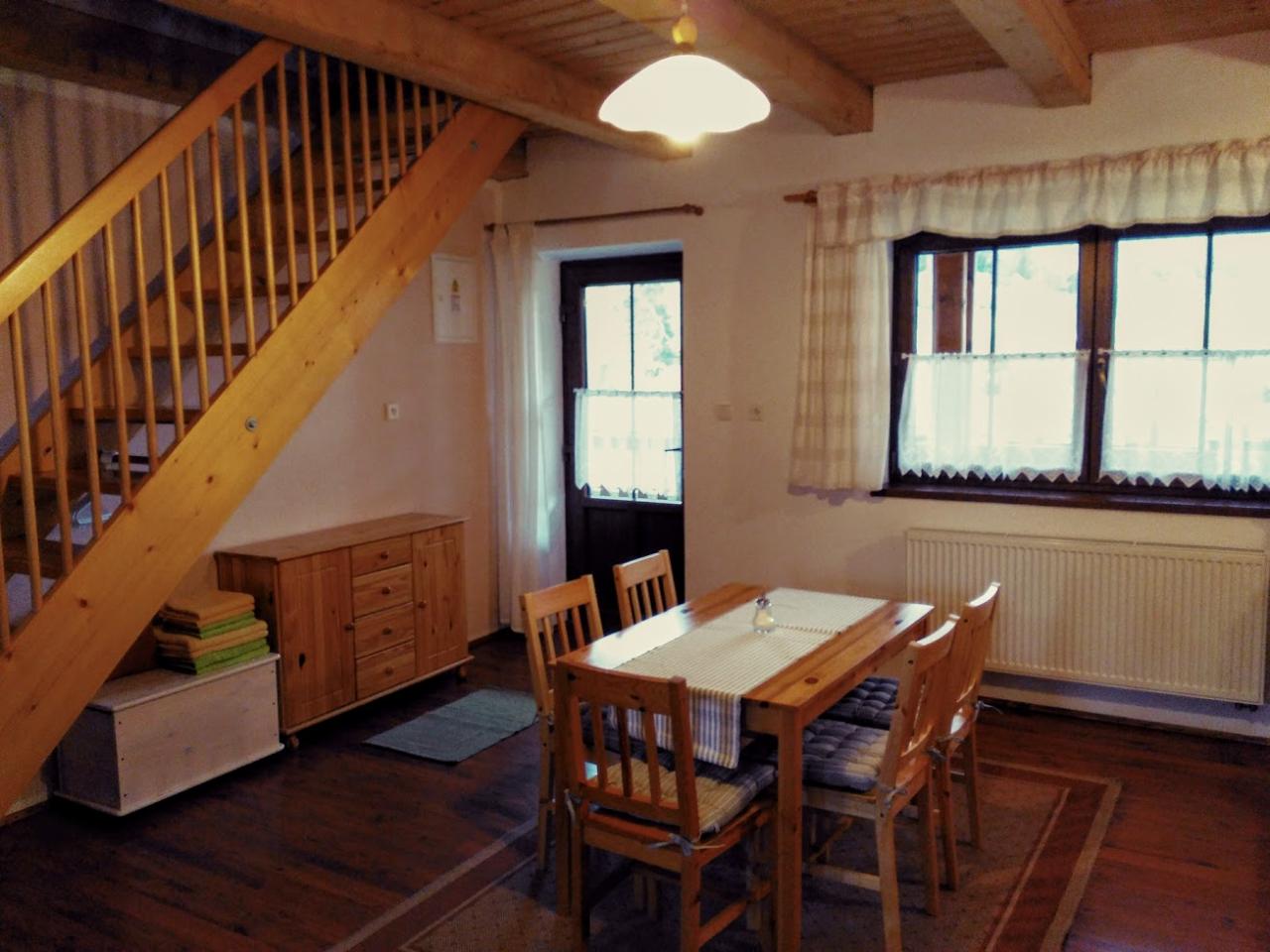 - obytná kuchyně, přístupná z pavlače, s plně vybaveným kuchyňským koutem (varná konvice, mikrovlnná trouba, kávovar, dvouplotýnková varná deska, lednička s mrazákem, myčka nádobí, utěrky, mycí prostředky, základní koření a drobnosti jako čaj, káva, cukr, sůl), jídelní kout a dětská stolička, rozkládací kanapíčko pro odpolední dřímání, celodřevěné schodiště do ložnice opatřené brankou pro malé děti,
