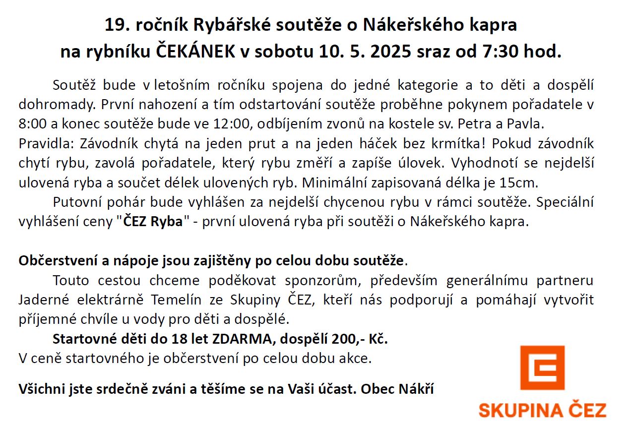19. ročník Rybářské soutěže o Nákeřského kapra proběhne 10. května 2025 na rybníku ČEKÁNEK. Sraz od 7:30, soutěž začíná v 8:00 a končí v 12:00. Pravidla stanovují lov na jeden prut a jeden háček bez krmítka. Občerstvení zajištěno, startovné pro děti zdarma, pro dospělé 200 Kč.