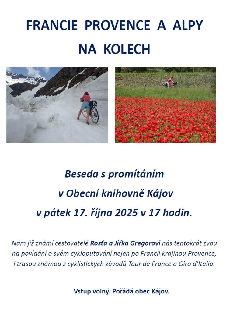 Přijďte na besedu s promítáním, která se uskuteční v pátek 17. října 2025 v 17 hodin v Obecní knihovně Kájov. Cestovatelé Rosťa a Jiřka Gregorovi nám představí své cykloputování po Francii, zaměří se na krásy Provence a také na trasy, které jsou známé z cyklistických závodů jako Tour de France a Gir