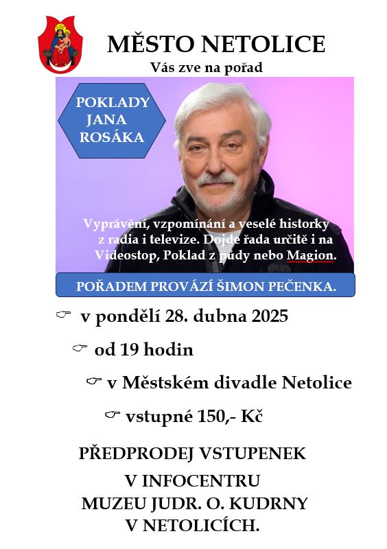 Jan Rosák & Šimon Pečenka – POKLADY JANA ROSÁKA - vyprávění, vzpomínání a veselé historky z radia i televize. Dojde řada určitě i na Videostop, Poklad z půdy nebo Magion. V pondělí 28. dubna 2025 v Městském divadle Netolice od 19 hodin. PŘEDPRODEJ VSTUPENEK V MUZEU -INFOCENTRU NETOLICE. Cena 150,- Kč.