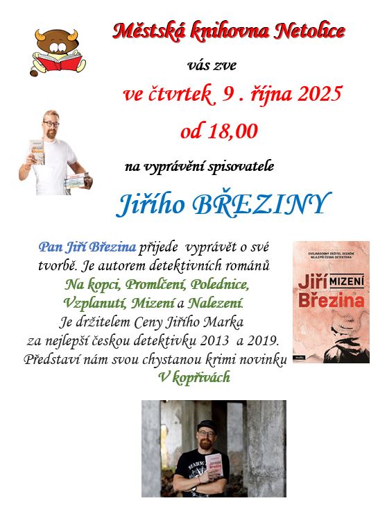 Pan Březina je autorem detektivních románů Na kopci, Promlčení, Polednice, Vzplanutí, Mizení a Nalezení. Je držitelem Ceny Jiřího Marka za nejlepší českou detektivku - 2013 a 2019. Představí nám svou chystanou krimi novinku V kopřivách.