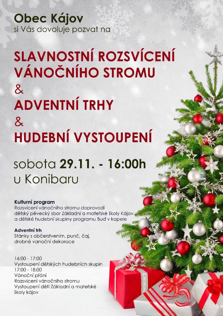 Obec Kájov vás srdečně zve na slavnostní rozsvícení vánočního stromu a adventní trhy, které se konají 29. listopadu 2025 od 16:00 u Konibaru. Těšit se můžete na kulturní program, který zahrnuje vystoupení dětského pěveckého sboru Základní a Mateřské školy Kájov a dětských hudebních skupin. Adventní trhy nabídnou stánky s občerstvením, punč, čaj a drobné vánoční dekorace. Přijďte si užít vánoční atmosféru a společně oslavit příchod adventu.
