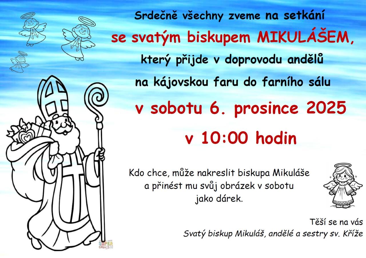 Zveme vás na setkání se svatým biskupem Mikulášem, které se uskuteční na kájovské faře. Akce začne v sobotu 6. prosince 2025 v 10:00 hodin ve farním sále. Přijďte si poslechnout příběhy a setkat se s anděly. Kdo chce, může nakreslit obrázek biskupa Mikuláše a přinést mu ho jako dárek. Těší se na vás nejen svatý biskup Mikuláš, ale také andělé a sestry sv. Kříže.