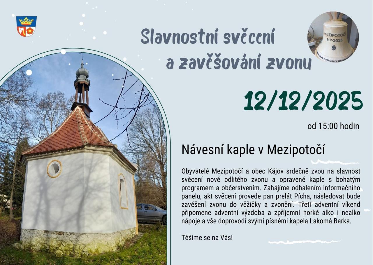 Obyvatelé Mezipotočí a obec Kájov vás zvou na slavnostní svěcení nově odlitého zvonu. Akce se koná 12. prosince 2025 v 15:00 hodin v návesní kapli v Mezipotočí. Program zahrnuje odhalení informačního panelu, akt svěcení pod vedením pana preláta Píchy, zavěšení zvonu do věžičky a jeho zvonění. Třetí adventní víkend doplní adventní výzdoba, horké alko i nealko nápoje a hudební vystoupení kapely Lakomá Barka.